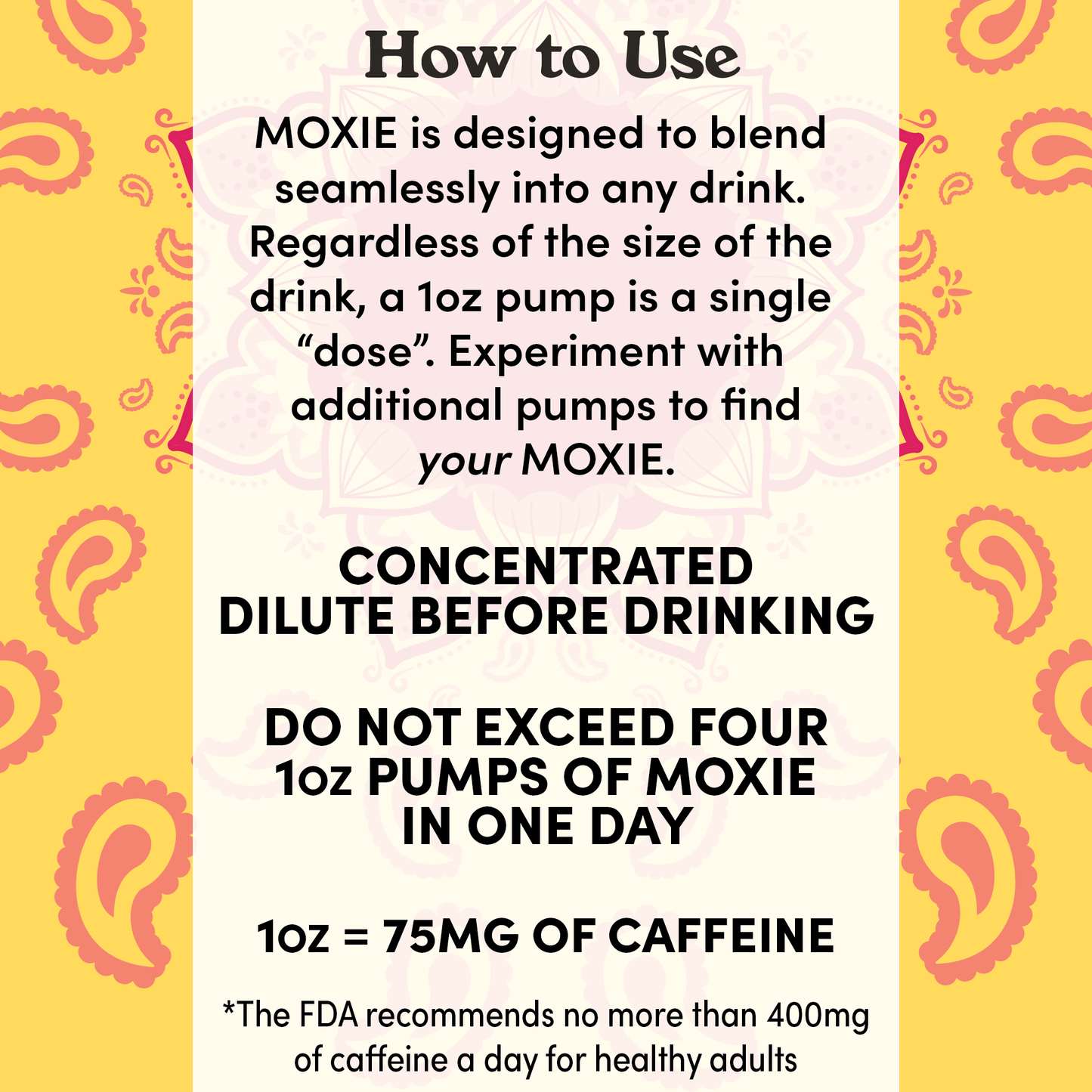 Moxie is packed with 75mg of caffeine in each serving to help put the swagger back in your stride. We added L-theanine and B12 to prevent you from crashing and burning after you've exercised your Moxie.