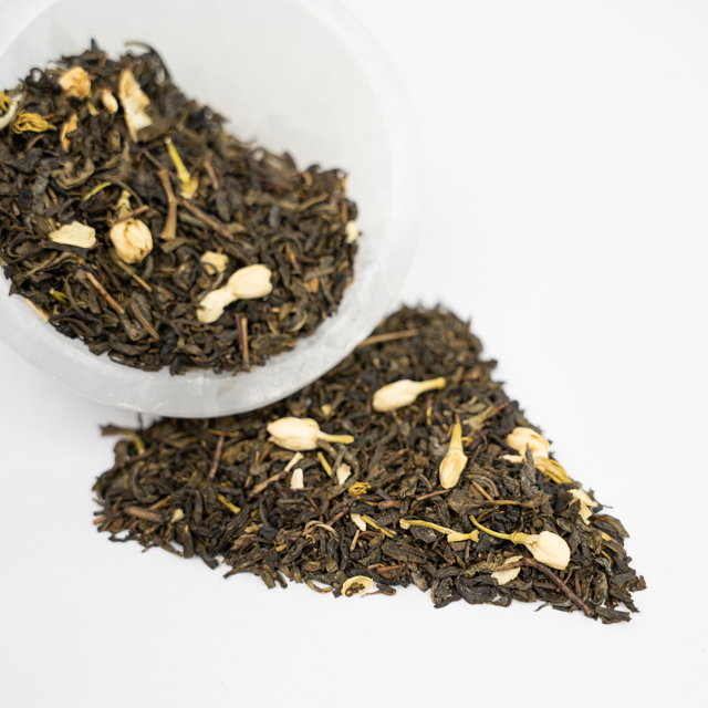 Our Blackberry Jasmine Green Tea starts with our lovely Young Hyson Green Tea for a robust, lively cup. Next we add chunks of vine‐ripened Blackberries and a palmful of snow‐white Jasmine Flowers for an authentic floral note in each sip. We finish it all off with a drizzle of our All Natural Flavors. Though this tea is delicious hot, it also makes a unique and cooling treat served over ice.